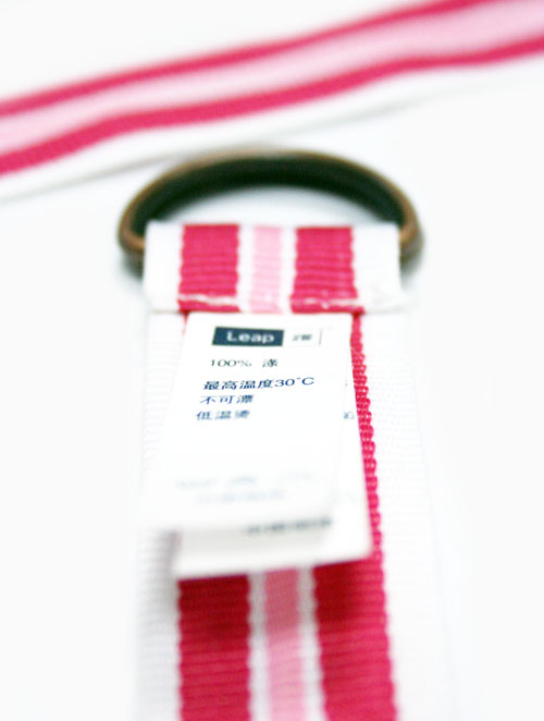 2.4cm涤纶彩色织带,尾端车缝收口;