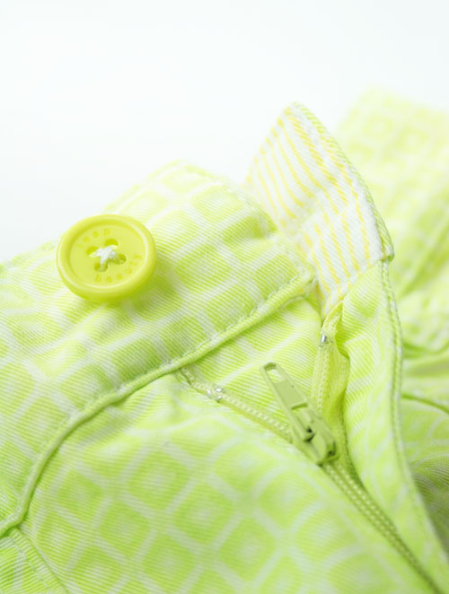 门襟为装饰胶钮,底面为金属裤钩;配色尼龙拉链开门襟;