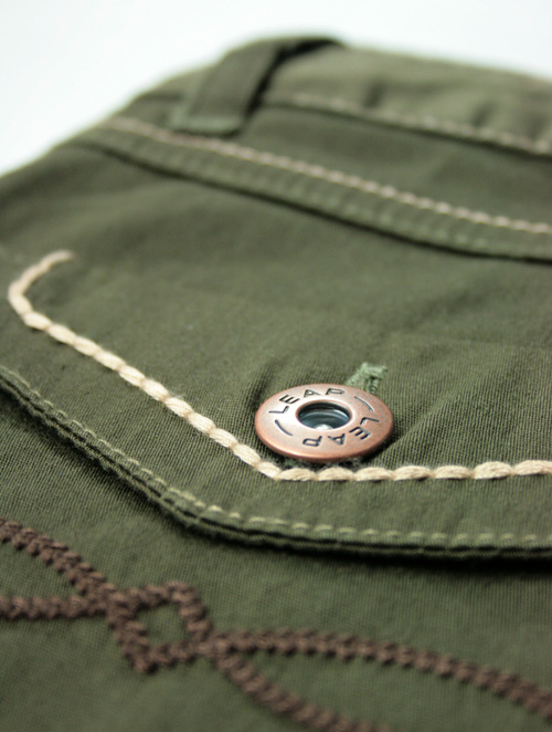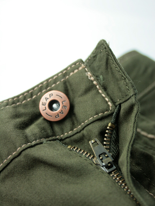 拉链开门襟;金属钮扣(刻字LEAP);可调节橡筋内腰;